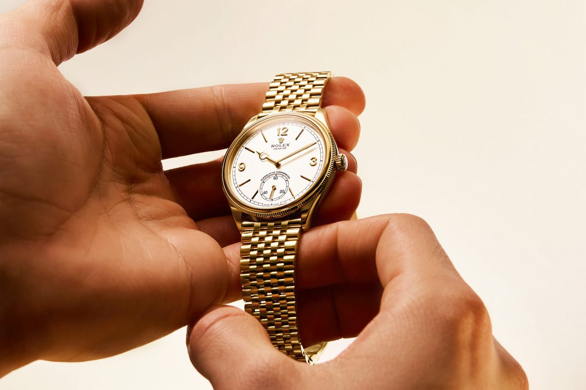 Armband, nur für mich (und die 1908). Das siebengliedrige Armband aus 18 Karat Gelbgold trägt sich butterweich am Handgelenk, ohne dass es schmierig gleitet. Die winzigen Glieder sorgen zweifellos für die nötige Beweglichkeit, und es schließt mit einer vollständig verdeckten Faltschließe, die nur durch die Rolex-Kronenlasche sichtbar wird. Rolex Replica gibt an, dass es ein „spezielles System“ zur Befestigung am Gehäuse gibt, aber es scheint, als würden sie sich nur auf passende Endglieder beziehen, da das System das Armband speziell für die 1908 macht. Die Einführung eines Schnellverschlusses war wohl zu viel verlangt.