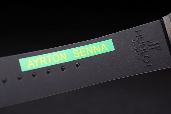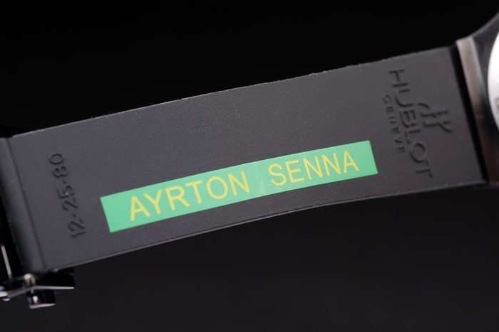 Armband: Gerippte schwarzen Kautschukarmband mit Hublot Geneve geprägt auf der Innenseite zusammen mit Ayrton Senna Stempel grün und fold over Haken-Schließe mit Hublot Geneve engraving