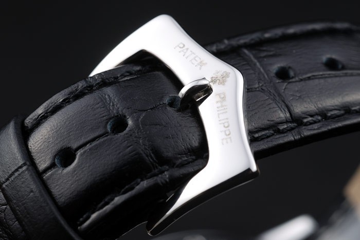 Armband: Schwarzes Lederband mit Patek Philippe Stempel und einem Edelstahl-Falte in clasp
