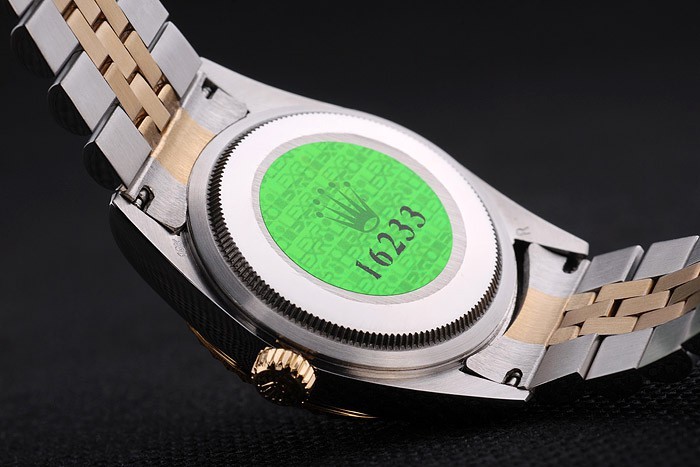 Rückseite: Edelstahl Push-Gehäuseboden mit grünen Rolex-Logo stamp
