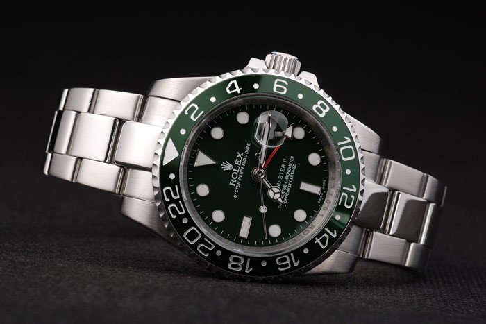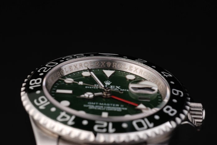 Back Bewegung: Push-in Edelstahl zurück mit grünen Rolex Aufkleber und markings